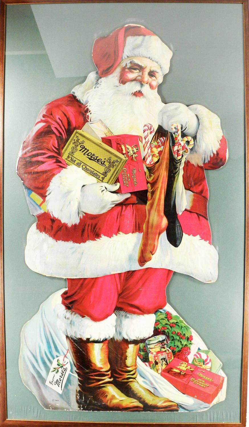 Morse's Chocolates Die Cut Cardboard Sign. Depicting Santa, dated 1923. Vivid colors. Framed under glass. Some minor scuffs, dog ears and paper loss around edges otherwise very good condition. 30 X 65 inches image only.