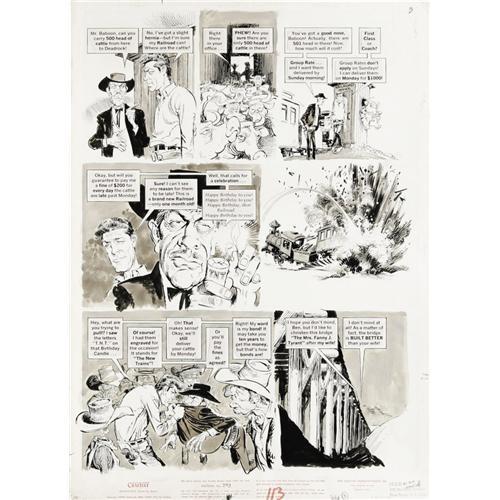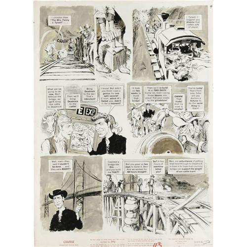 <B>Mort Drucker - Mad #113, Complete 6-page Story "The Iron Horselaff" Original Art (EC, 1967).</B></I> Six stupendous drawings from Mort Drucker's miraculous pen, for the feature, "The Iron Horselaff," a satire of parodying the television program, "The Iron Horse." Each page has an image area of approximately 16" x 20". Ink on Craftint board. There is some scattered glue staining; otherwise the pages are in Very Good condition. <I>From the Mad Magazine Archives</B></I>. <BR><BR><B>Important notice:</B> Heritage usually auctions material at the rate of 200-250 lots per hour. On some occasions eBay Live bid software or the Internet may not be able to keep up with the pace of the auction. We recommend placing a realistic absentee bid now as insurance to avoid disappointment. Occasionally the auctioneer may eliminate or reject an eBay Live bid, and the auctioneer may also reopen a lot after the close of the eBay live bidding (usually because we missed an audience bid), and may reject your bid even if it shows you as the winning bidder. By bidding via eBay Live, you agree that Heritage may award the lot to another bidder at its sole discretion under the circumstances described above or any other reasonable circumstances. Since eBay bids are not shown to us until we open the lot on the floor, we treat those bids just like floor bids. In most cases the floor responds before the eBay bid is presented to us, due to Internet lag time, so for consistency we have made it a policy that floor bids are always considered first over tie eBay live bids. Also please note that all Heritage lots purchased through eBay Live carry a 22.5% Buyer's Premium. Please make sure you read the Terms and Conditions before you bid. This lot is being auctioned in conjunction with a live floor auction by Heritage Auction Galleries. All final auction and invoice information will be supplied by Heritage Auction Galleries, and all other information should be considered preliminary. Lot:41001 <BR><BR><B>Winning Notification and Billing:</B> After the FINAL session in this auction is complete, Heritage will send e-mail and snail mail invoices. This process normally takes several days. All final auction and invoice information will be supplied by Heritage Auction Galleries, and all other information should be considered preliminary. <BR><BR>This auction will be conducted on a live auction floor and over the Internet through eBay Live. If you choose to place an absentee bid, please take a moment to <font color='#0000ff'><u><a href='http://pages.ebay.com/liveauctions/help/before/laabsentee.html'>learn how eBay Live absentee bidding works</a></u></font><font color='#000000'>