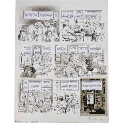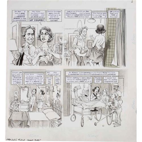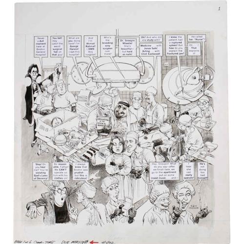 <B>Mort Drucker - Mad #202 Complete 6-page Story "Coma-Toast" Original Art (EC, 1978).</B></I> Mort Drucker's art for this "Coma" movie lampoon will keep you wide-awake and laughing out loud. Drucker's caricatures of Michael Douglas, Genevieve Bujold, Richard Widmark, and Rip Torn are a scream. The first two pages of this story have approximate image areas of 16.5" x 16.5", while the rest of the pages have image areas of about 17" x 20". The art is in Excellent condition. <I>From the Mad Magazine Archives</B></I>.