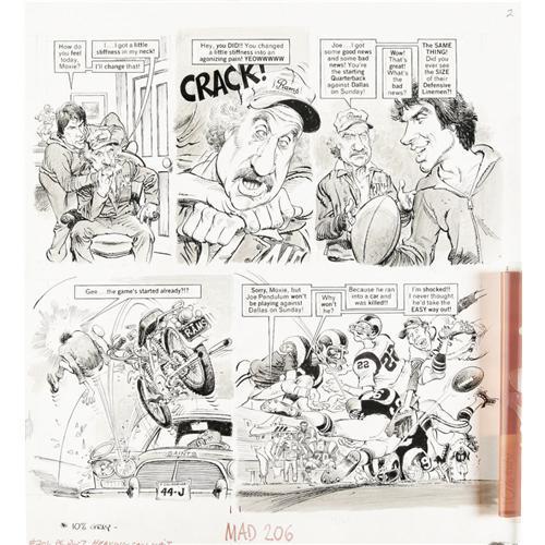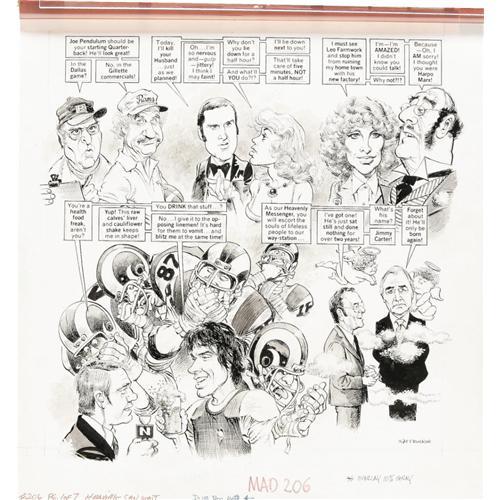 <B>Mort Drucker - Mad #206, Complete 7-page Story "Heaving Can Wait" Original Art (EC, 1979).</B></I> Exuberant Mort Drucker line work livens up this seven page feature film satire, "Heaving Can Wait." Each page has an image area of approximately 16" x 19". Ink and ink wash. In Excellent condition. <I>From the Mad Magazine Archives</B></I>. <BR><BR><B>Important notice:</B> Heritage usually auctions material at the rate of 200-250 lots per hour. On some occasions eBay Live bid software or the Internet may not be able to keep up with the pace of the auction. We recommend placing a realistic absentee bid now as insurance to avoid disappointment. Occasionally the auctioneer may eliminate or reject an eBay Live bid, and the auctioneer may also reopen a lot after the close of the eBay live bidding (usually because we missed an audience bid), and may reject your bid even if it shows you as the winning bidder. By bidding via eBay Live, you agree that Heritage may award the lot to another bidder at its sole discretion under the circumstances described above or any other reasonable circumstances. Since eBay bids are not shown to us until we open the lot on the floor, we treat those bids just like floor bids. In most cases the floor responds before the eBay bid is presented to us, due to Internet lag time, so for consistency we have made it a policy that floor bids are always considered first over tie eBay live bids. Also please note that all Heritage lots purchased through eBay Live carry a 22.5% Buyer's Premium. Please make sure you read the Terms and Conditions before you bid. This lot is being auctioned in conjunction with a live floor auction by Heritage Auction Galleries. All final auction and invoice information will be supplied by Heritage Auction Galleries, and all other information should be considered preliminary. Lot:41001 <BR><BR><B>Winning Notification and Billing:</B> After the FINAL session in this auction is complete, Heritage will send e-mail and snail mail invoices. This process normally takes several days. All final auction and invoice information will be supplied by Heritage Auction Galleries, and all other information should be considered preliminary. <BR><BR>This auction will be conducted on a live auction floor and over the Internet through eBay Live. If you choose to place an absentee bid, please take a moment to <font color='#0000ff'><u><a href='http://pages.ebay.com/liveauctions/help/before/laabsentee.html'>learn how eBay Live absentee bidding works</a></u></font><font color='#000000'>