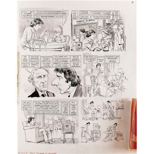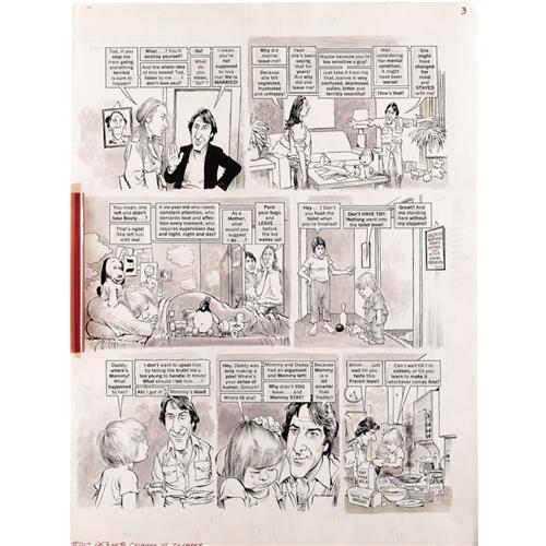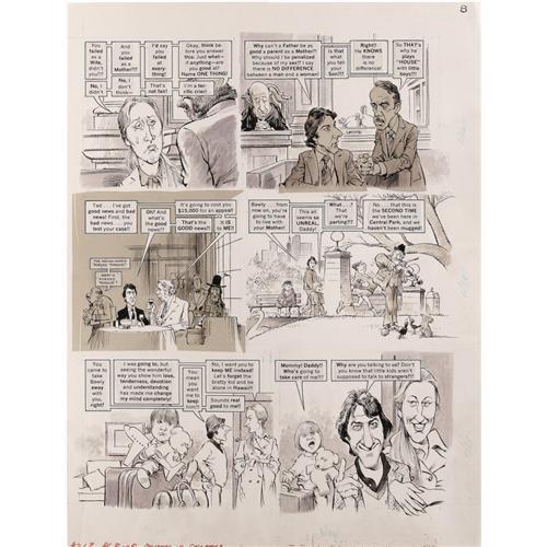 <B>Mort Drucker - Mad #217 "Crymore vs. Crymore" Original Art, Group of 7 (EC, 1980).</B></I> Acting greats Dustin Hoffman and Meryl Streep receive the ultimate honor -- a <B>Mad</B></I> parody, drawn by Mort Drucker. This eight-page story is missing page five (there is a photostat of it, with the note "this page of art is missing") of the yarn. The pages have an approximate overall size of 18" x 24", and, aside from the missing page five, the art averages Excellent condition. The amberlith overlays for the pages are included in this lot. <I>From the Mad Magazine Archives.</B></I>