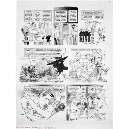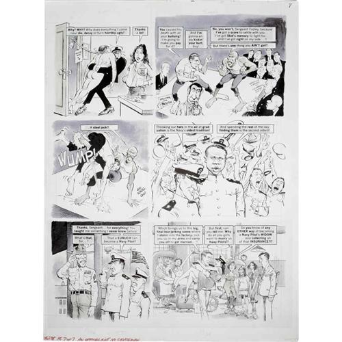 <B>Mort Drucker - Mad #238 Complete 7-page Story "An Officer Ain't No Gentleman" Original Art (EC, 1983).</B></I> Mort Drucker shoots down the high-flying cast of "An Officer and a Gentleman." Drucker's sensational caricatures of Richard Gere, Debra Winger, David Keith, and Louis Gossett Jr. score a direct hit, as always! Page two of this story has an approximate image area of 16" x 15.5". The rest of the pages have approximate image areas of 16" x 20". Pages two and three have amberlith overlays. The art is in Excellent condition. <I>From the Mad Magazine Archives</B></I>.