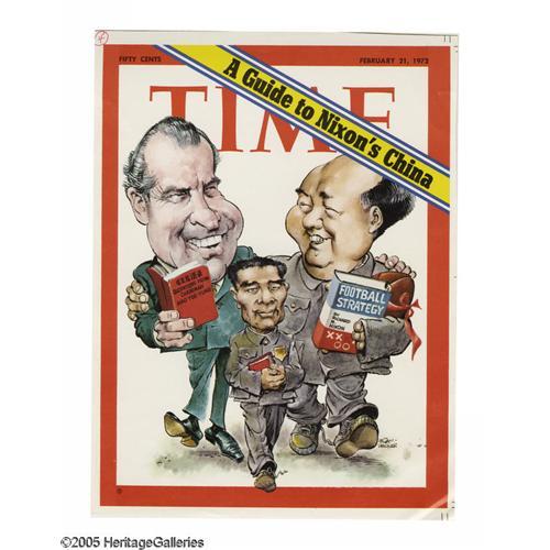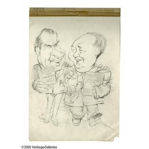<B>Mort Drucker - Preliminary Artwork for Time Cover Original Art (1972).</B></I> It was certainly big news when, in 1972, President Nixon traveled to China to meet with Chairman Mao. In comic art circles, it was no less an event when <B>Mad</B></I> artist Mort Drucker received the plum assignment to capture these world leader's likenesses for the cover of <B>Time</B></I>. Here is Drucker's original pencil preliminary sketch, plus a set of nine progressive color proofs of the final printed version. The sketch is on a large, 11" x 16" piece of heavy paper, and has a few extra details that didn't make the final cut. A piece of tissue overlay with some color notes about the books each man is holding is attached to the drawing. A small corner has been torn off the page; this does not affect the image area, and could be covered by a matted frame. Other than this small flaw, the art is in Excellent condition. This groundbreaking cover was a real highlight in Drucker's long career, and a piece that will be well remembered for generations to come!