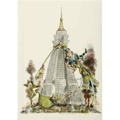 <B>Mort Drucker - Time International Cover Original Art (Time, 1970).</B></I> The N.Y.C sanitation strike of 1970 was the focus of this cover based on the <B>Time International</B></I> feature article, "City on Strike." Mort Drucker's lighthearted take on a smelly subject helps brings a smile to an otherwise troubling topic.This mixed-media painting has an image area of 13.5" x 18", and the art is in Excellent condition. <I>From the Personal Collection of Mort Drucker</B></I>.