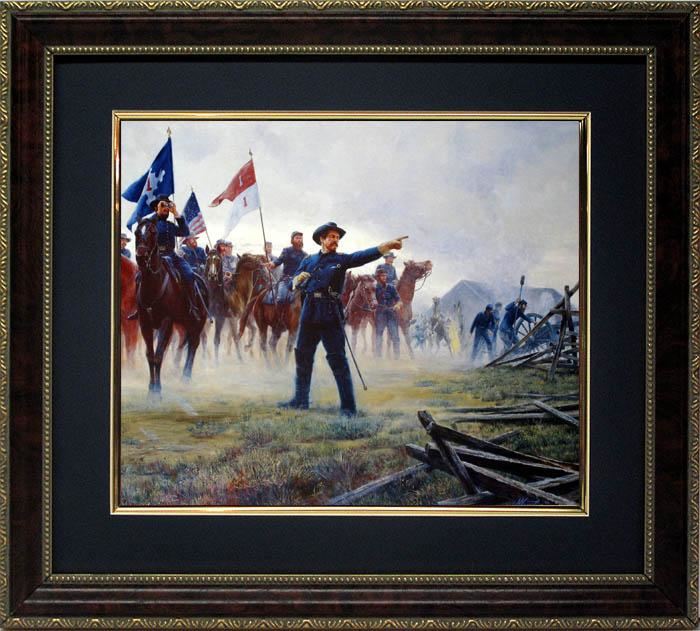 This exciting scene is of General John Buford at Gettysburg, July 1, 1863, and the title comes from his famous quote. Artist: Mort Kunstler Title: "The Devil to Pay" Medium: Print on acid free canvas textured paper Image Size: 13"x10.5" Edition: Framed and matted calendar printing Framing: In high quality mahogany frame Matte: choice of 4 colors, Navy Blue, Leaf Green, Grey, Burgundy Red Overall Size: 18"x16"Condition: Excellent condition