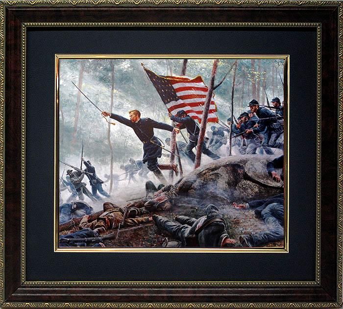 This dramatic print portrays Colonel Joshua Chamberlain leading his troops to a charge downhill to Little Round Top. * * * * Artist: Mort Kunstler * * Title: "Chamberlains Charge" * Medium: Print on acid free canvas textured paper * * Image Size: 13"x10.5" * * Edition: Framed and matted calendar printing * * Framing: In high quality mahogany frame * Matte: choice of 4 colors, Navy Blue, Leaf Green, Grey, Burgundy Red * Overall Size: 18"x16"Condition: Excellent condition * Chamberlain's Charge Little Round Top, July 2, 1863 For the sixth and final painting in the Killer Angels Portfolio I wanted to paint Colonel Joshua Chamberlain's charge down Little Round Top. However, there always seemed to be an obstacle in the way. The first problem involved the deadline for the book, Gettysburg, which was done as the companion piece for the Turner motion picture. There was no way I could finish a major painting of Chamberlain in time for the book's June deadline, so I decided to do a study showing Chamberlain with the flag. This image appeared in the book and was later used as the center of interest in the final painting. Other commitments continually postponed completion of the Chamberlain work until early 1994. Then, finally, after more than a year, "Chamberlain's Charge" was finished.