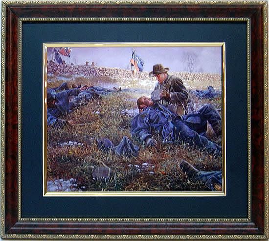 This artwork shows a man attending a wounded soldier on the battlefield. * * * Artist: Mort Kunstler * * Title: "Angel of Mayre's Height" * Medium: Print on acid free canvas textured paper * * Image Size: 13"x10.5" * * Edition: Framed and matted calendar printing * * Framing: In high quality mahogany frame, with blue matte * Overall Size: 18"x16"Condition: Excellent condition * He believed he had to help. Sergeant Richard Rowland Kirkland looked out on the field of battle at Fredericksburg, Virginia and was appalled at what he saw. The day before, he and other Southern troops in General Robert E. Lee s Army of Northern Virginia had turned back the Federal Army of the Potomac in one of the bloodiest battles of the Civil War. Wave after wave of courageous Northern troops had charged up Marye s Heights at Fredericksburg into the deadly massed fire of Confederate forces entrenched behind a fortified stone wall. The slaughter had been horrendous, and had left a carpet of blue-uniformed dead and wounded on the frozen slope of Marye s Heights. All night Kirkland and the other Southern defenders had listened to the heart-rending cries of the Federal wounded. * * * Finally, Kirkland could stand it no longer. At daylight on December 14th, the young sergeant in the 2nd South Carolina Infantry, requested permission to aid the enemy. His commanding officer was reluctant: Kirkland would likely be shot dead by Federal sharpshooters as soon as he showed himself above the wall. Kirkland was determined, however, and he was allowed to go but he could not carry a flag of truce or a weapon. The youth borrowed an armload of canteens from his fellow soldiers, and climbed over the wall onto the field of dead and wounded. * * * While the other Confederates braced themselves for the rifle shot that would fell Kirkland, the young sergeant calmly walked to the closest wounded Northerner. The opposing Federal troops held their fire long enough for Kirkland to kneel down, lift up the wounded man s head and give him a drink of water. A loud cheer arose and rolled down the Federal line. Silently, the astounded line of Northern troops watched Kirkland move to another wounded man in blue and give him aid. Both sides held their fire while the courageous sergeant moved from one suffering soldier to another. Going back and forth over the wall for an hour and a half, Kirkland had done all he could do, and he returned safely to the Confederate line behind the wall. * * * It was an extraordinary event in an extraordinary war, and served as a heartfelt reminder that these enemies in blue and gray Southerners and Northerners facing each other on the field of battle were Americans all.