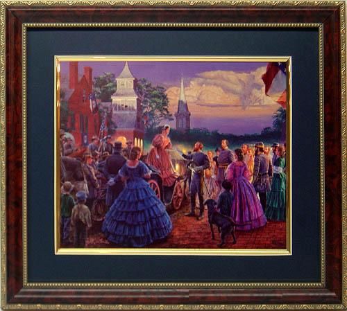 A touch of magic is displayed as General Lee and soldier guests arrive for the grand ball. Artist: Mort Kunstler Title: "Before The Ball" Medium: Print on acid free canvas textured paper Image Size: 13"x10.5" Edition: Framed and matted calendar printing