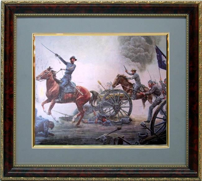 This compelling action scene is from the very onset of the Civil War. * * * * Artist: Mort Kunstler * * Title: "First to the Guns" * Medium: Print on acid free canvas textured paper * * Image Size: 13"x10.5" * * Edition: Framed and matted calendar printing * * Framing: In high quality mahogany frame * Overall Size: 18"x16"Condition: Excellent condition * "Only three weeks after Bull Run, the first major Civil War battle in the West was fought at Wilson's Creek near Springfield, Missouri. Confederate Colonel James McIntosh, above, led a charge of the Third Louisiana Infantry against a Union battery, an incident that helped turn the battle in the Confederate's favor. A few months later, at Pea Ridge in Arkansas, a Northern army defeated the Southerners and kept Missouri in the Union. * * * In the first major battle of the western theatre, a Louisiana brigade, carrying their state 'pelican' flag overran a federal artillery position and helped turn the tide into another victory for the South. * - Mort Kunstler