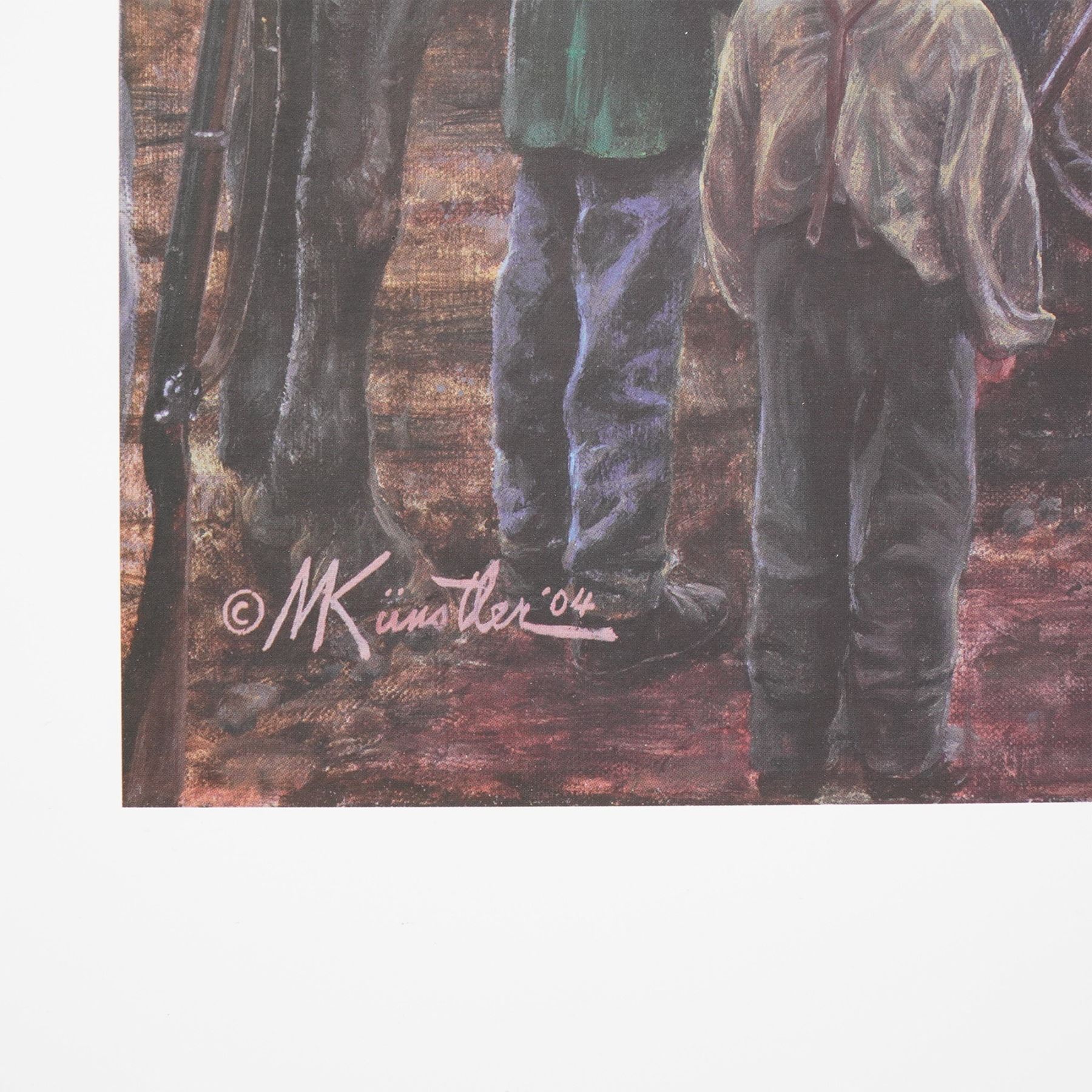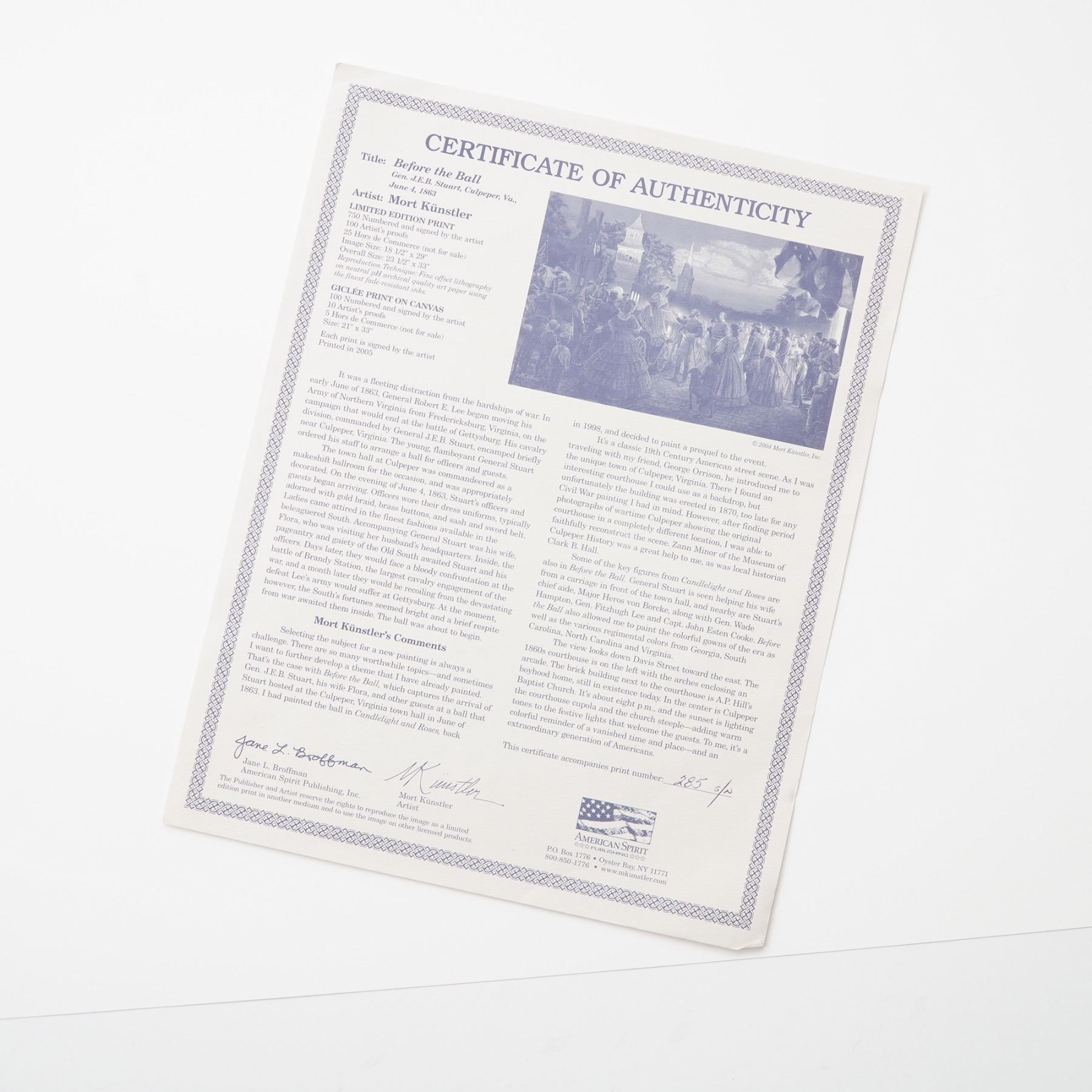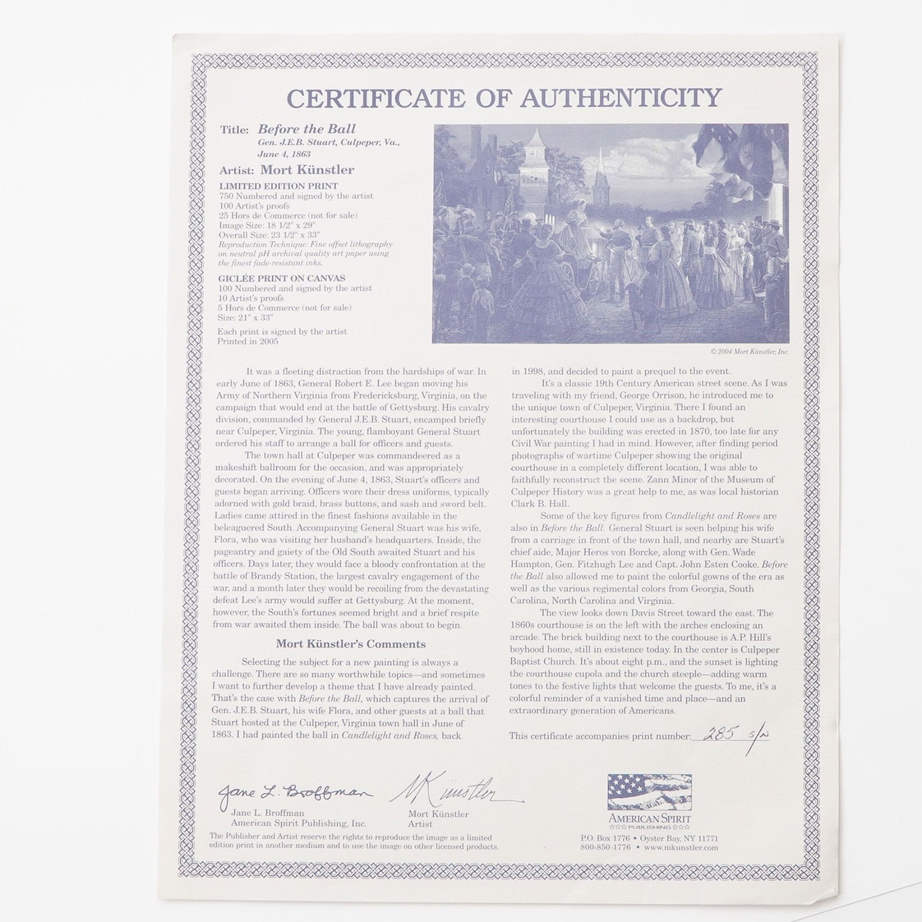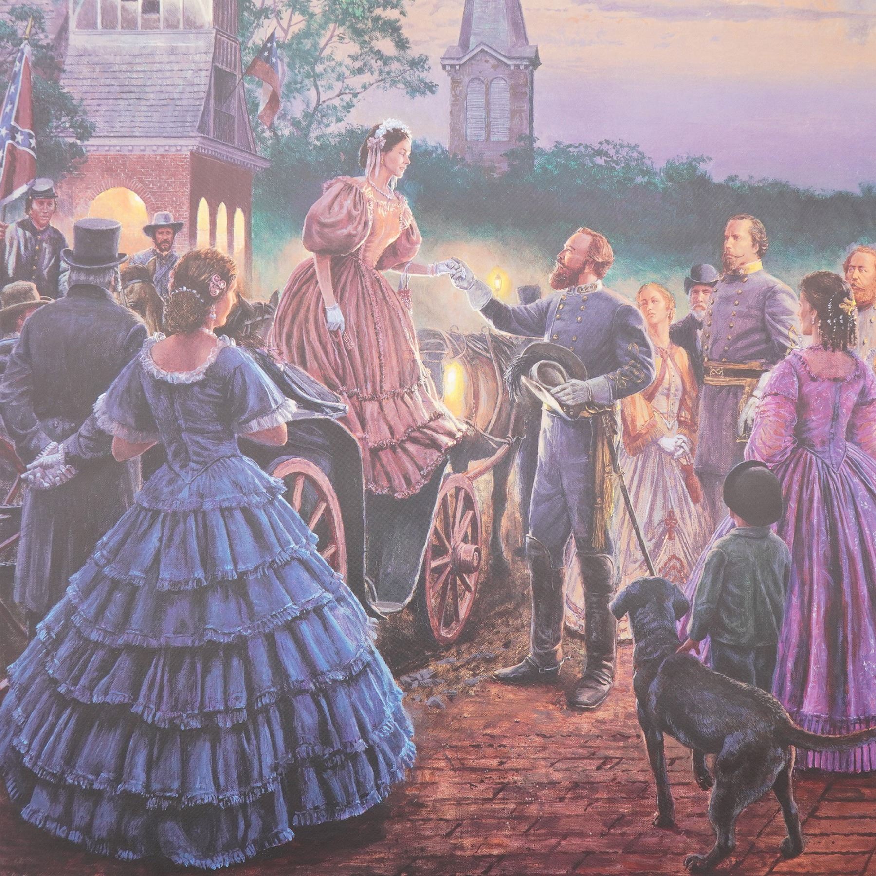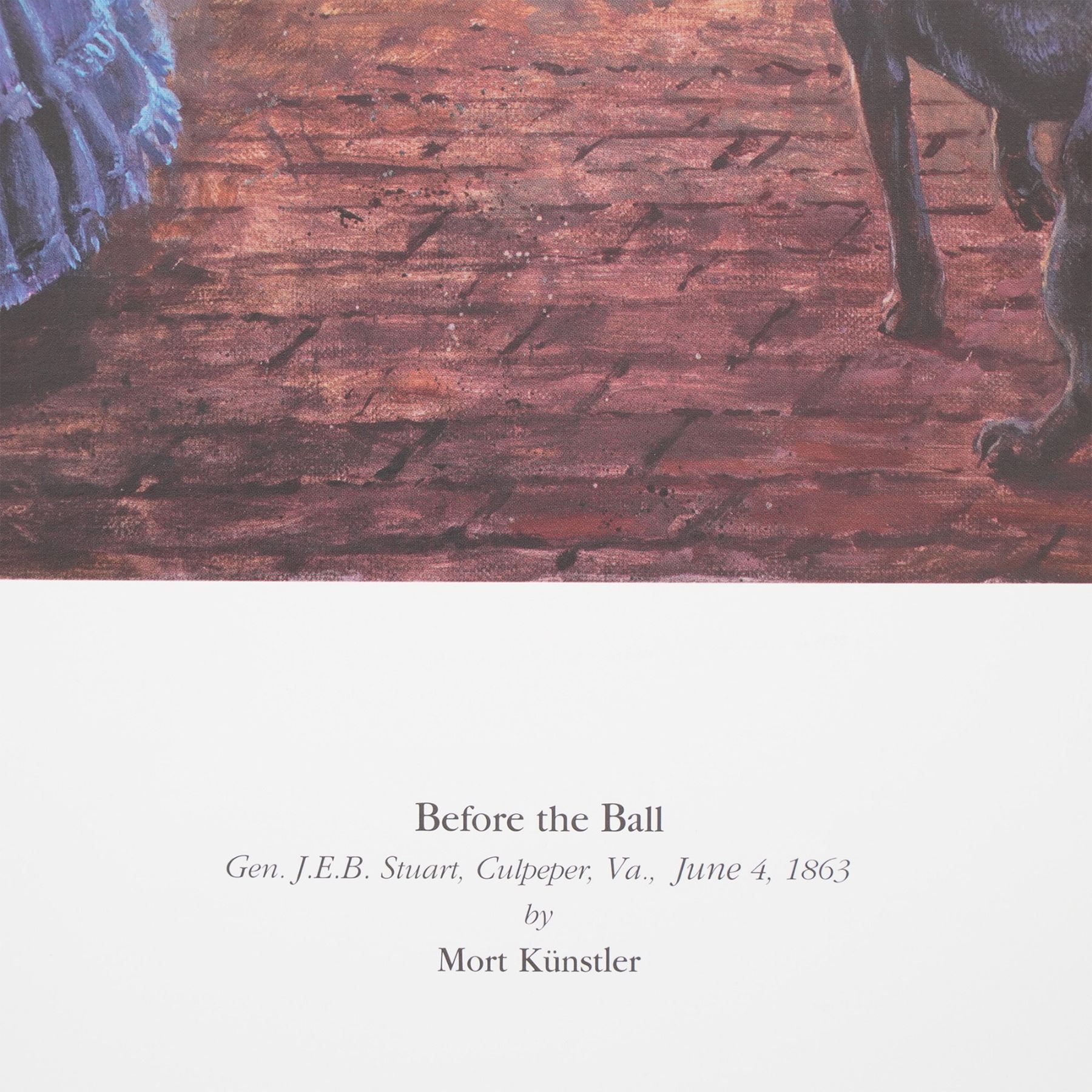 This limited edition fine offset lithograph entitled Before the Ball (Gen. J.E.B. Stuart, Culpeper, Virginia, June 4, 1863) after Mort Kunstler's original, captures an elegant prelude to a grand social event during the Civil War era. The vibrant scene features a gathering of men, women, and children adorned in period attire, lit by the warm glow of lanterns and a colorful sunset. Kunstler is expert in storytelling and composition is evident in every element, from the meticulous rendering of fabrics and architecture to the lively interplay of color and light. The artist signature with a limited edition 285 of 750 are on the lower right corner of the image. Certificate of Authenticity included.