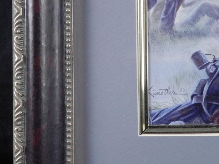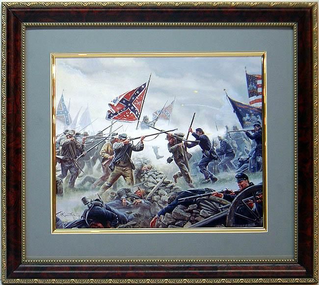 This exciting, life-like artwork portrays a battle at Gettysburg on July 3, 1863. * * Artist: Mort Kustler * Title: "The High Tide"Medium: Print on acid free canvas textured paper * Image Size: 13 x 10 1/2 inches * Edition: Framed and matted calendar printing * Framing: In high quality mahogany frame, with gray matteFrame Size: 18 1/2 x 16 1/2 inchesCondition: Excellent conditionArtist's statement * "In conceiving this painting, The High Tide, I was looking for a way to show this dramatic moment in a way that would be completely different from my first Civil War print for APG, The High Water Mark, released in 1988. That print was done for the 125th Anniversary of the Battle of Gettysburg and has since been reproduced and permanently installed in an outdoor display at the exact site by the Gettysburg National Military Park. * By looking north, I was able to show the Confederates coming from the left instead of the right, during Pickett's Charge. I also decided to come in tighter on the scene and not have as much of a panoramic effect as in my previous version. I dropped my eye level lower to give the painting a different look. By moving south on the line to the Angle where hand to hand combat took place and by showing the stone wall, I believe the scene is easily identifiable as Gettysburg to the knowledgeable collector. * Most of the flags shown in this painting are standard Confederate battle flags, with the 9th Virginia Infantry seen in the center and the 56th Virginia Infantry found in the background. To the right, is the regimental flag of the 72nd Pennsylvania and the state issue flag of the 71st Pennsylvania. The 72nd was a semi-zouave regiment, but had lost most of their distinctive uniform by this time. The only remnants were the low, white canvas gaiters containing four buckles on each side. These can be seen on two of the soldiers in the right background. The Cloverleaf and number 69 on the hat of the soldier fighting in the right foreground identifies him as a soldier of the 69th PA. * Perhaps the most difficult painting an artist can do is to try another version of a previously successful on and not have it look like he is copying himself. I have always tried to top myself, so to speak, and I hope I have succeeded in The High Tide, At any rate, in the upcoming book, Gettysburg that is due out this fall, featuring all of my Gettyburg paintings, The High Tide has been selected as the cover painting by Turner Publishing."---kunstler.org *