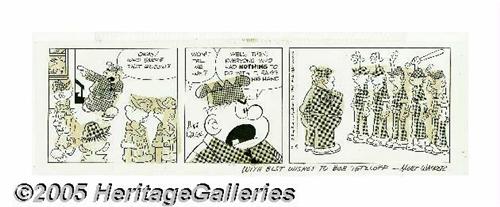 <B>Mort Walker - Beetle Bailey Daily Comic Strip Original Art, dated 5-9-67 (King Features Syndicate, 1967).</B></I> Sarge uses psychology to figure out who broke the window to his office and, as usual, Beetle comes out on the losing side. A terrific gag by Mort Walker. The art is in Very Good condition, with some missing Zip-a-Tone and discoloration. The image area measures 15.5" x 4.5", and the piece is signed "With best wishes to Bob Tetzloff -- Mort Walker" in the lower margin.