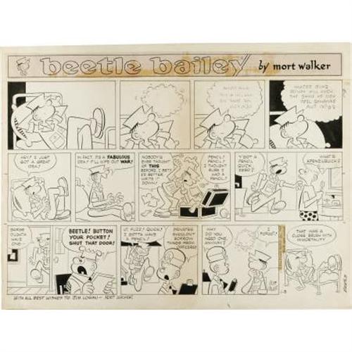 <B>Mort Walker - Beetle Bailey Sunday Comic Strip Original Art, dated 1-3-64 (NEA Inc., 1964).</B></I> Beetle's dream of ending war fades away during the course of everyday life. This Sunday has an image area of 24" x 15.5", and aside from glue stains in the title logo stat and a stain down the center of the strip, the art is in Good condition. This strip was signed by Mort Walker in its lower border. <I>From the Jim Logan Collection.</B></I><BR><BR><b>Shipping:</b> Flat Material, Large (<a target="_blank" href="http://www.heritageauctions.com/common/shipping.php">view shipping information</a>)