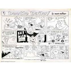 Mort Walker - Original Comic Strip Art for Beetle Bailey (King Features Syndicate, 1966). Mort Walker nails it with this incisive Batman parody. Done at the height of '60s Batmania, Mort's "Fatman and Slobber" - along with the Fatmobile - are a hilarious jab at the TV adventures of the Caped Crusader. This is a great strip for Batman collectors, as well as Beetle Bailey fanatics. As an added bonus, Walker has signed and remarked this piece with a small Beetle headsketch in the lower margin. 20" x 14 1/4" overall. Important notice: We expect to be auctioning lots at the rate of 200-250 per hour. Sometimes eBay Premier live bid software cannot keep up with that pace, so we strongly recommend that you place a realistic proxy bid now as insurance to avoid disappointment. Also please note that all Heritage/CAA lots purchased through eBay Premier carry a 20% Buyer's Premium.