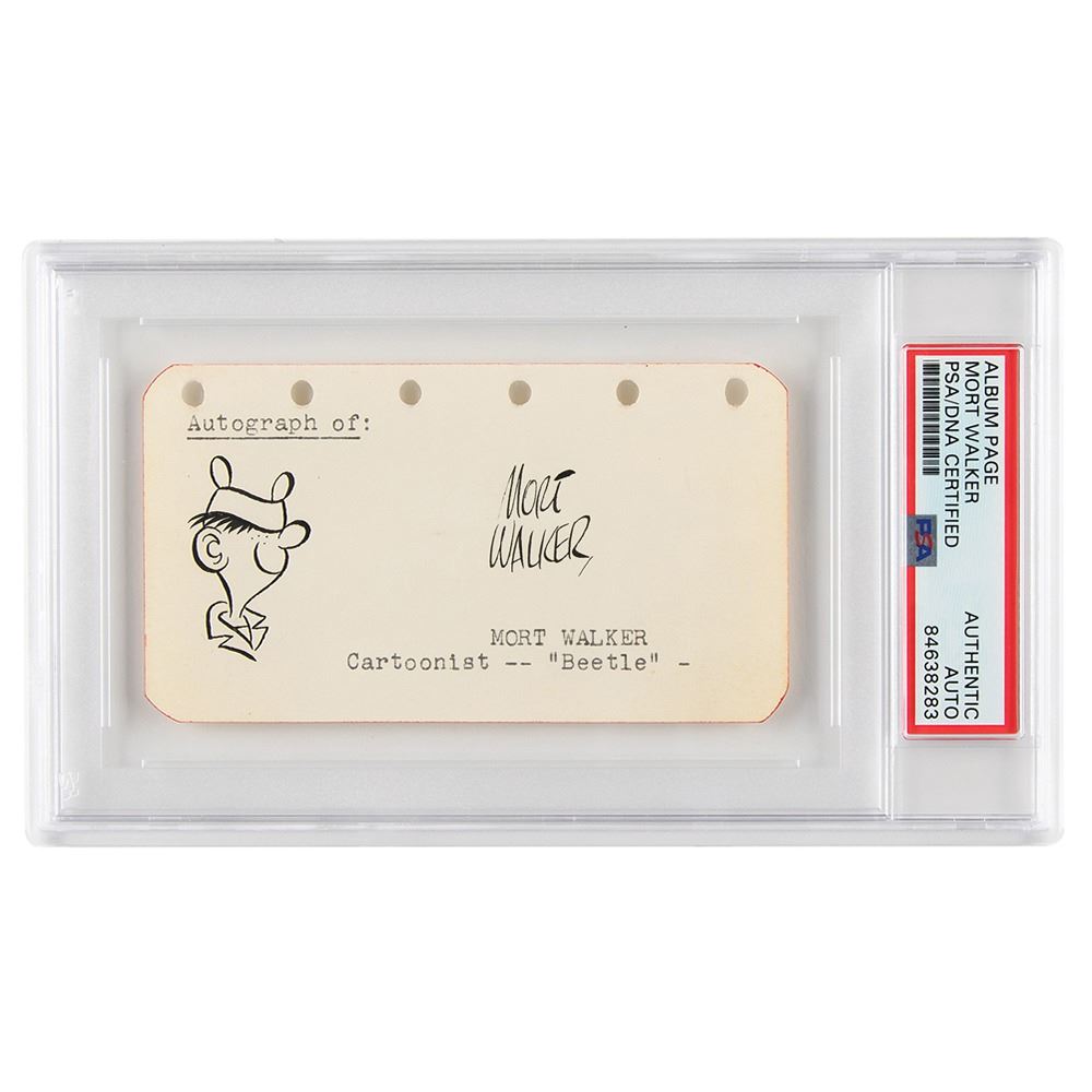 Original vintage ink sketch of Beetle Bailey accomplished by Walker on an off-white 4.5 x 2.5 page, signed in bold ink, "Mort Walker." In fine condition. Encapsulated in a PSA/DNA authentication holder.