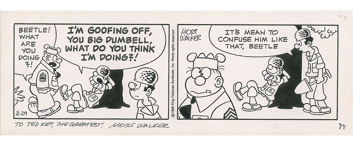 Original hand-inked two-panel Beetle Bailey comic strip on an off-white 14 x 5 sheet of artist’s cardstock, signed in the last panel, “Mort Walker,” and signed and inscribed in the lower border, “To Ted Key, the Greatest! Mort Walker.” The comic shows Beetle lounging against a tree and exclaiming, “I’m goofing off, you big dumbell, what do you think I’m doing?!” A 1988 King Features copyright notice is affixed to the center. In fine condition. Ted Key was the creator of the comic Hazel, which appeared in The Saturday Evening Post. A fine association between prominent American cartoonists.