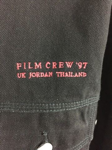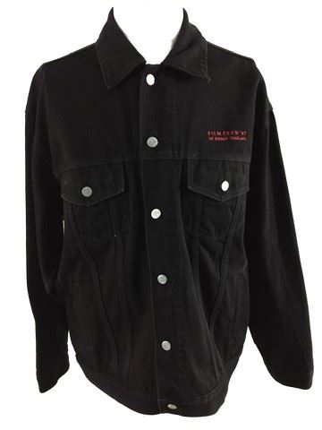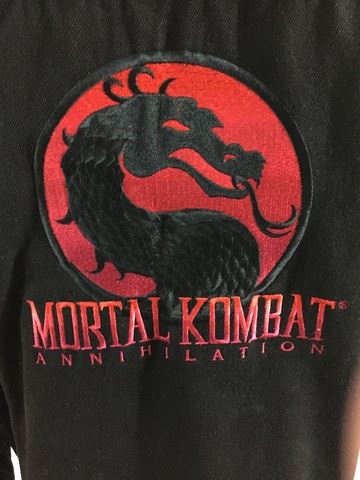 Black button-up denim jacket (XL), made by Calvin Klein for film crew of Mortal Kombat Annihilation (1997). Back of the jacket displays the franchise logo of a black dragon in front of a red circle above the words "Mortal Kombat Annihilation". Front of the jacket, above the left breast pocket, is embroidered "Film Crew '97 UK Jordan Thailand".