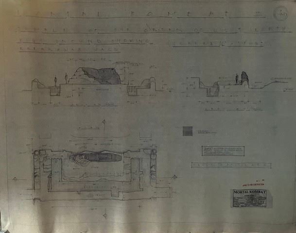 Approved construction blueprints for Temple of the Light in Mortal Kombat Annihilation. These blueprints were the ones used to create and build the sets in Mortal Kombat Annihilation. They were designed and supervised by production designer Charles Wood, who went on to production design Guardians of the Galaxy, Avengers: Endgame and Doctor Strange, under supervision of Producer Lawrence Kasanoff (True Lies) and New Line. These are extremely rare and as far as we know, the only ones like them that exist. 40"x35". Set of 6. These incredible props come direct from the film production company, Threshold Entertainment and are part of their archive collection.