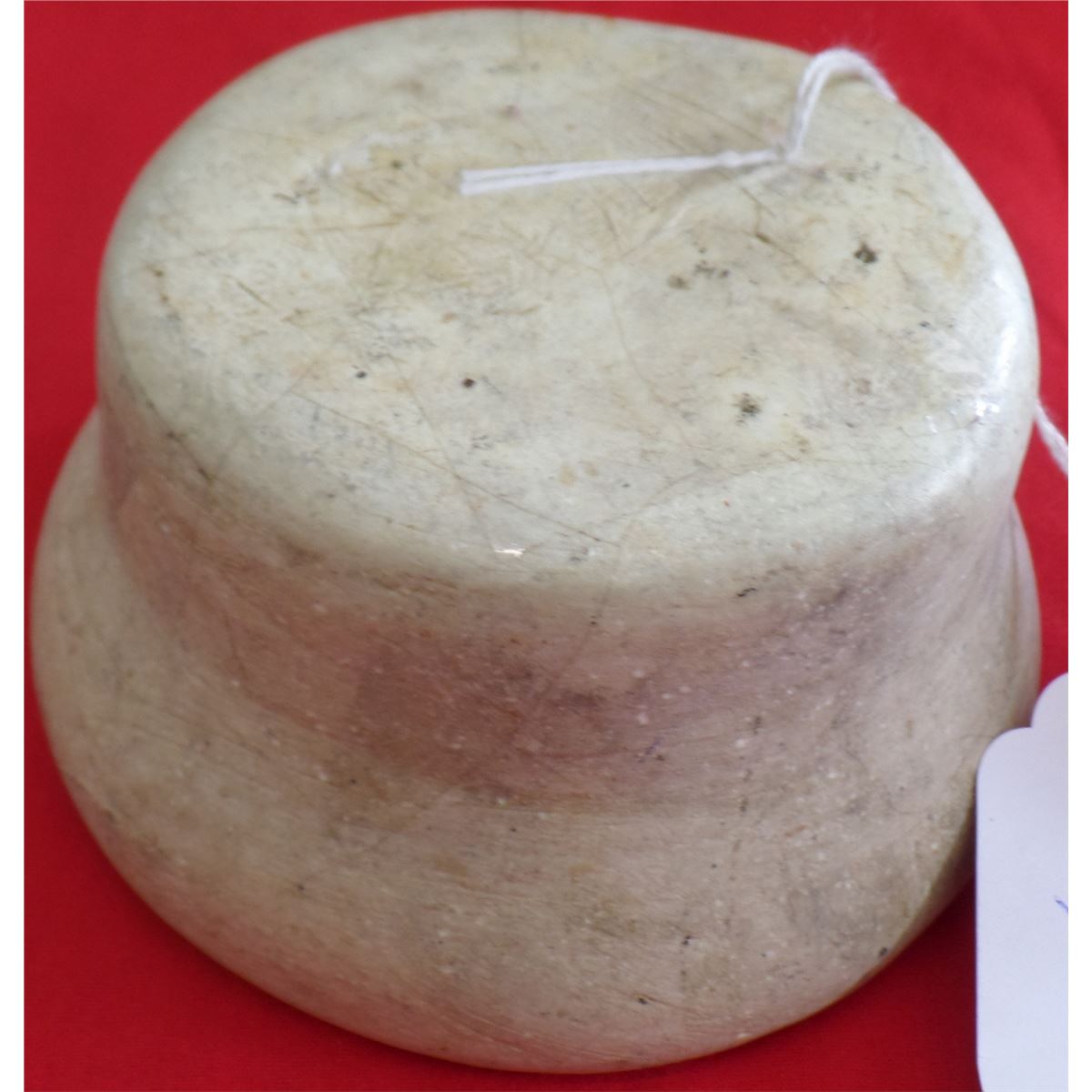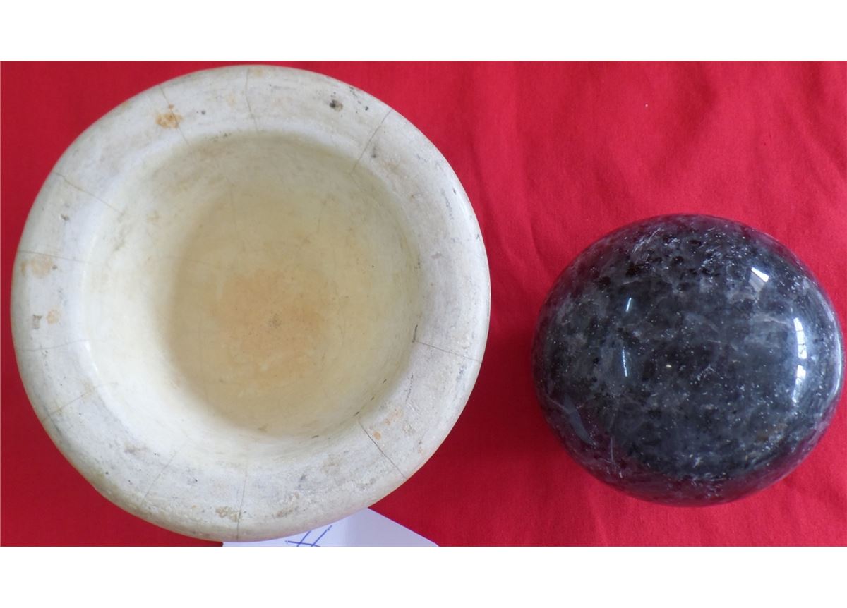 Possibly 1890's mortar and pestle. The mortar is 4 x 2 1/2 inches and pestle is 3" round. The bowl is marble and pestle is granite. This item may be Hupa from San Francisco. Condition: There is minor wear and cracks from use. Shipping: $20.