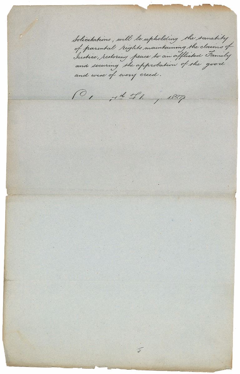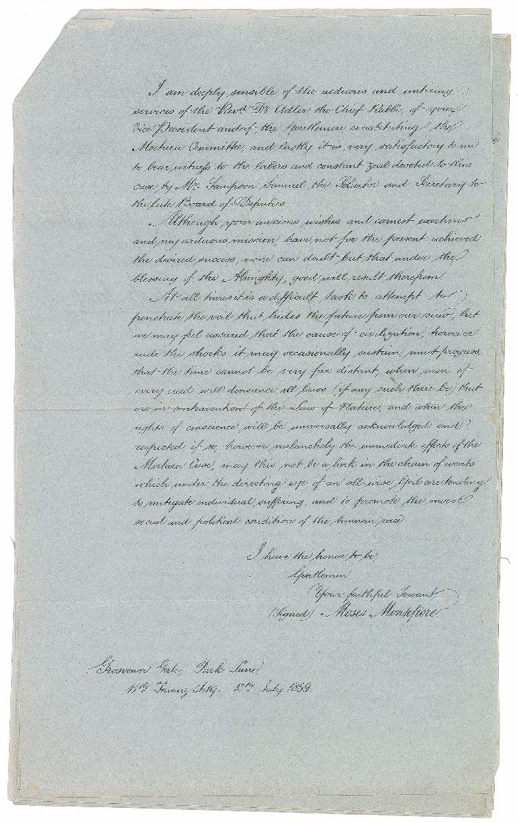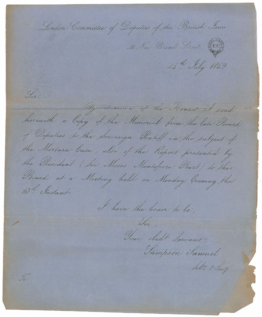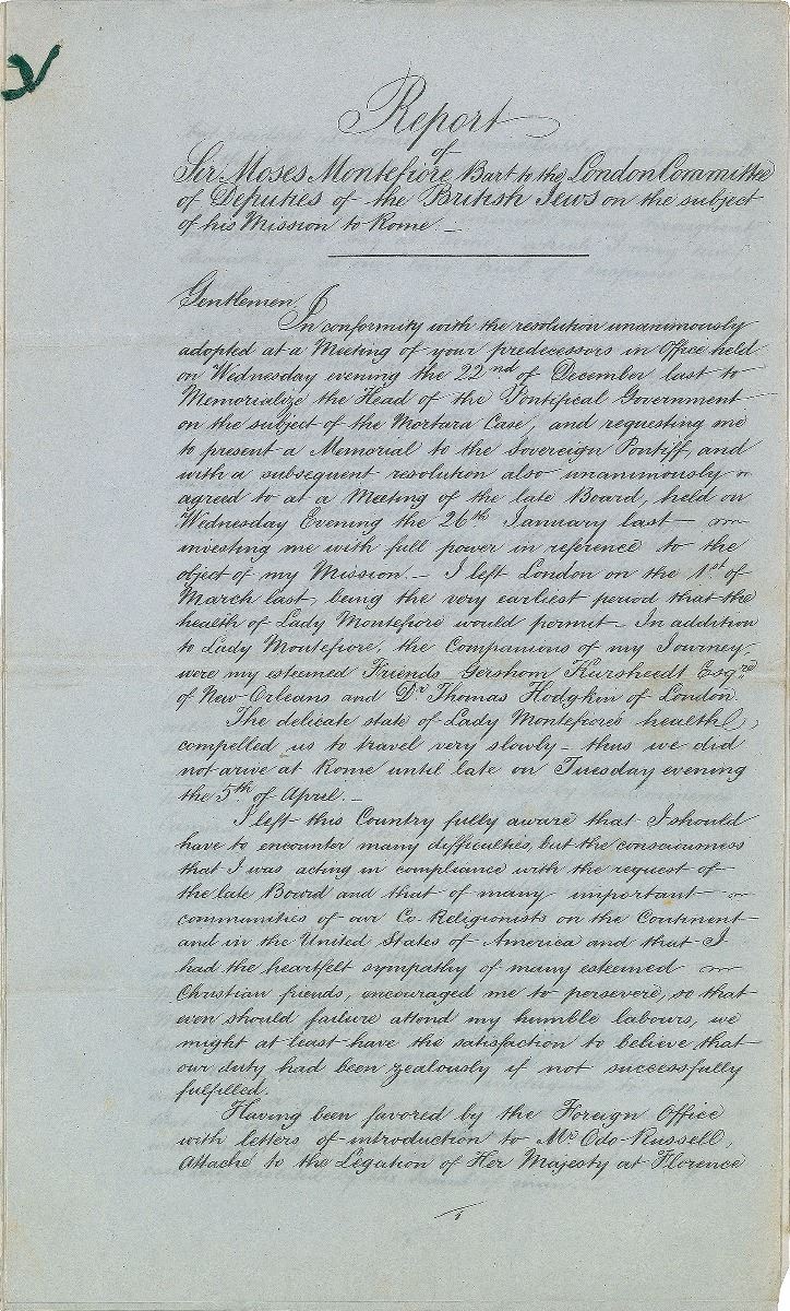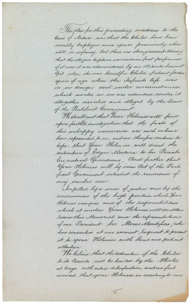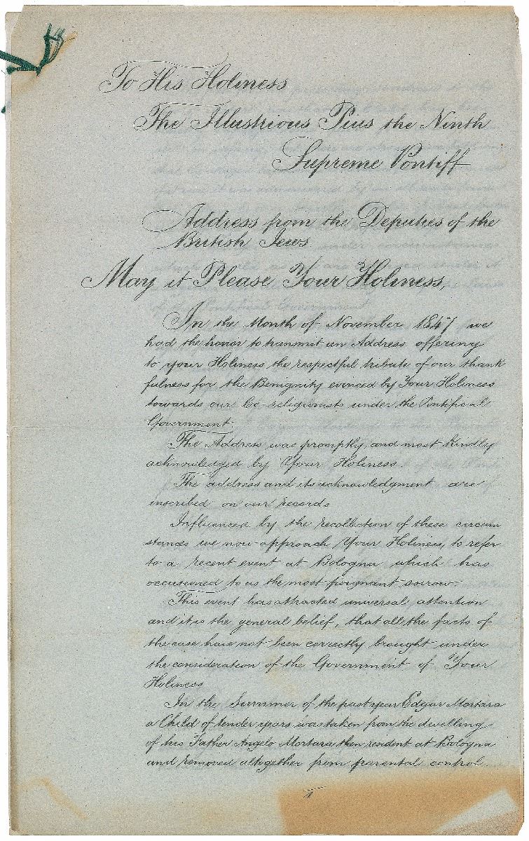 Three printed documents regarding the controversial case of the kidnapping of Edgardo Mortara, including a copy of the letter from the Deputies of the British Jews to Pope Pius IX, three pages, February 7, 1859; a copy of Moses Montefiore’s report on the case, eight pages, 8 x 13, July 13, 1859; and a cover letter enclosing the report. The letter to the pope, in part: “In the Summer of the past year Edgar Mortara a Child of tender years was taken from the dwelling of his Father Angelo Mortara then resident at Bologna and removed altogether from parental control. The plea for this proceeding, so adverse to the laws of Nature, was that the Child had been secretly baptized some years previously…We believe that restoration of the Child to its Parents will be hailed by the World at large with entire satisfaction.” Montefiore’s report describes his attempts to meet with the pope and enter a plea for the boy’s return, in part: “I left this Country fully aware that I should have to encounter many difficulties…My first endeavour was to obtain an audience of the Sovereign Pontiff, and as the Representative of the Board, to place the Memorial in his hands and urge a compliance with its prayer, but…was received with great courtesy by his Eminence Cardinal Antonelli…The Cardinal received the Memorial from my hands and undertook to present it to the Sovereign Pontiff stating that he had presented to His Holiness similar Memorials from Holland Germany and other Countries. He considered the Mortara case a most unfortunate one but as the child (as his Eminence alleged) had been baptized it would be contrary to the Laws of the Holy See to allow it to return to its parents without that religious education to which it was entitled as a member of the Roman Catholic Church…I then urged that the fact of Baptism had not been satisfactorily proved…His Eminence replied that the question had been fully discussed…and therefore I must not expect an answer from the Sovereign Pontiff.” In very good condition, with toning and chipping to the edges. Despite the international controversy caused by this strange scenario, the boy was never returned to his parents and Pope Pius IX essentially served as a surrogate father; Edgardo Mortara grew up to become a priest and did successfully connect with his true family. An utterly fascinating collection of material related to this often forgotten but quite important historical event.