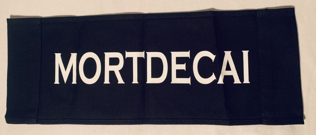 Original chairback used in the production of the action comedy film 'Mortdecai' (2015), where Juggling angry Russians, the British Mi5, and an international terrorist, debonair art dealer and part-time rogue Charlie Mortdecai races to recover a stolen painting rumored to contain a code that leads to lost gold.