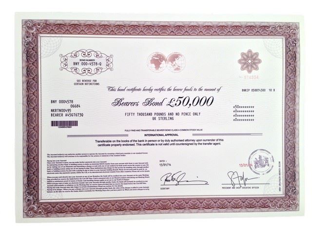 50,000 pound sterling 'Bearers Bond' on high quality stationary paper (11.5"x8")
