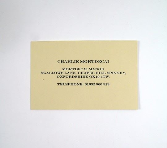 Mortdecai (Johnny Depp) screen used, Mortdecai crest on the front and information on the back business card. (approx. 3 1/8" x 2 1/8")