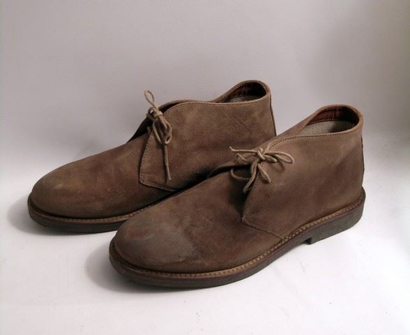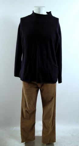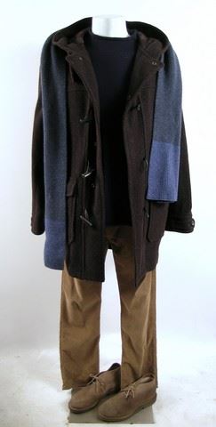 Martland (Ewan McGregor) screen worn, hero, chocolate long sleeve button front with checker print inside 'Buttler and Webb' heavy coat, (size M) navy wool with roll neck long sleeve 'Albany' shirt, two tone blue cable knit scarf, camel corduroy 'Gap' pants, (size 32) tan leather with brass square buckle belt, and taupe suede 'Aldo' desert boots. (size 10)