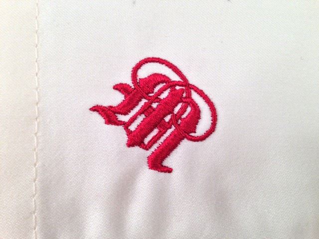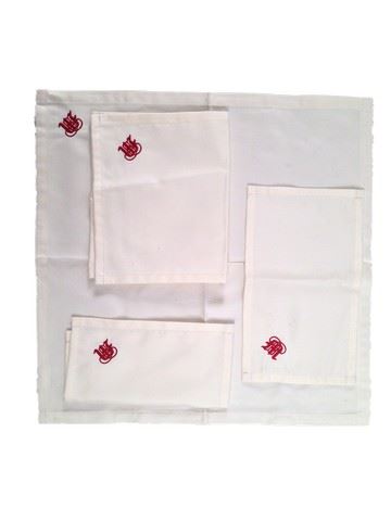 Mortdecai screen used monogrammed napkin collection, including: 4 'John Lewis' cotton and polyester napkins, all with Mortdechai's official red monogram (sizes 17.5"x17", 14.5"x9", 10.5"x6.5" and 8.5"x8.5").
