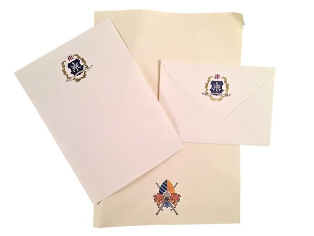 Mortdecai screen used monogramed stationary with 1 piece of 11"x8.5" stationary paper with a sword and shield crest, 1 piece of 8.5"x6" stationary paper with the 'Mortdechai' name and crest, and 1 small envelope with the 'Mortdechai' name and crest (6.5"x4.5"). The large piece of stationary has a crease along the side. Condition may vary.