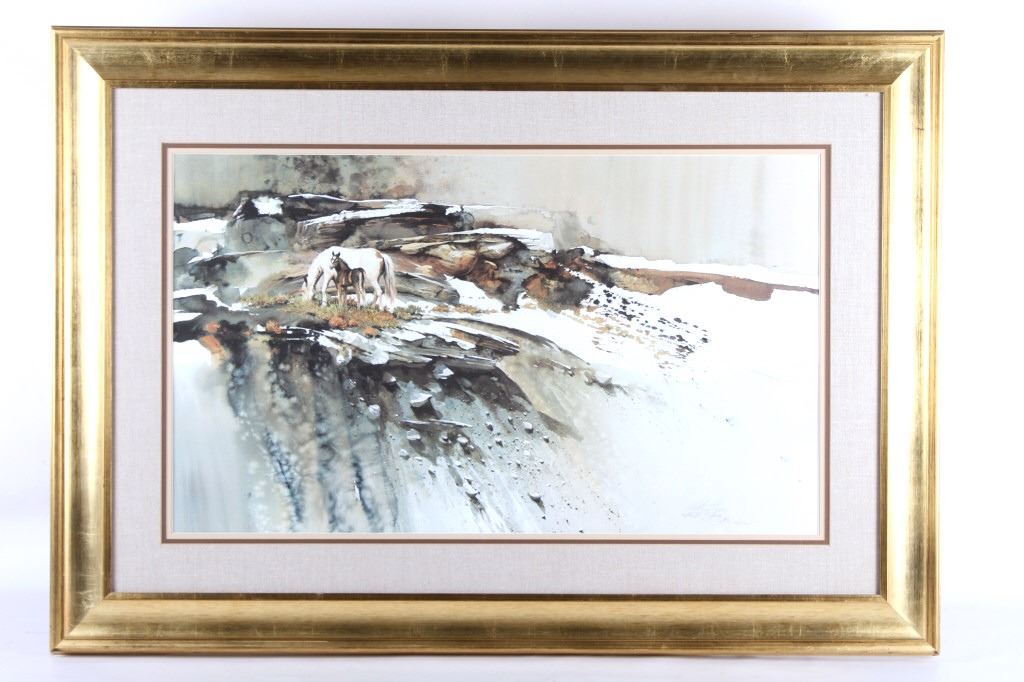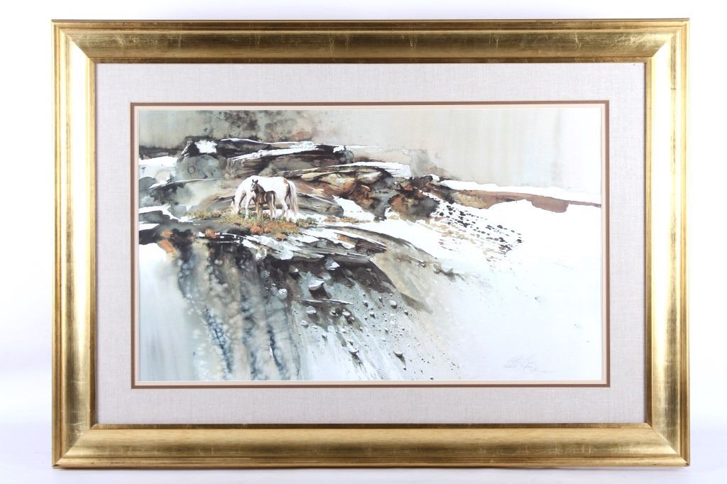This lot features a Morton E. Solberg print " Horse In Winter. The print is professionally framed. Morten E. Solberg is known around the world for his amazing work and signature style. He is an artist's artist. Versatile in all mediums. He paints in oil, acrylic and watercolor and his techniques range from photo-realism to total abstraction. His art has received awards and been on the cover of magazines such as American Artist. The piece is in good condition for its age. Measures: 45" W x 31" H