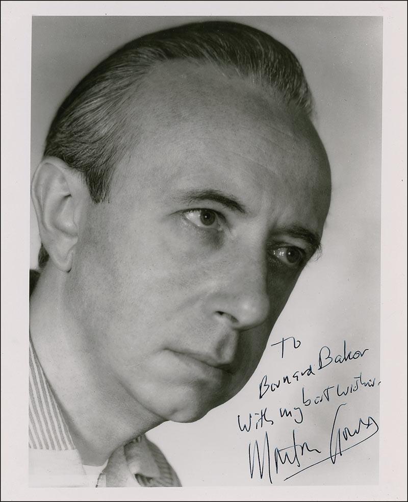 Composer, conductor, arranger, and pianist (1913-1996) who led all of the major orchestras in the United States as well as Australia, Canada, Europe, Japan, and Mexico. Glossy 8 x 10 photo, signed and inscribed in black ink “To Bernard Baker, With my best wishes. Morton Gould.” In fine condition, with light surface impressions and a paperclip indentation at the left border. RRAuction COA.