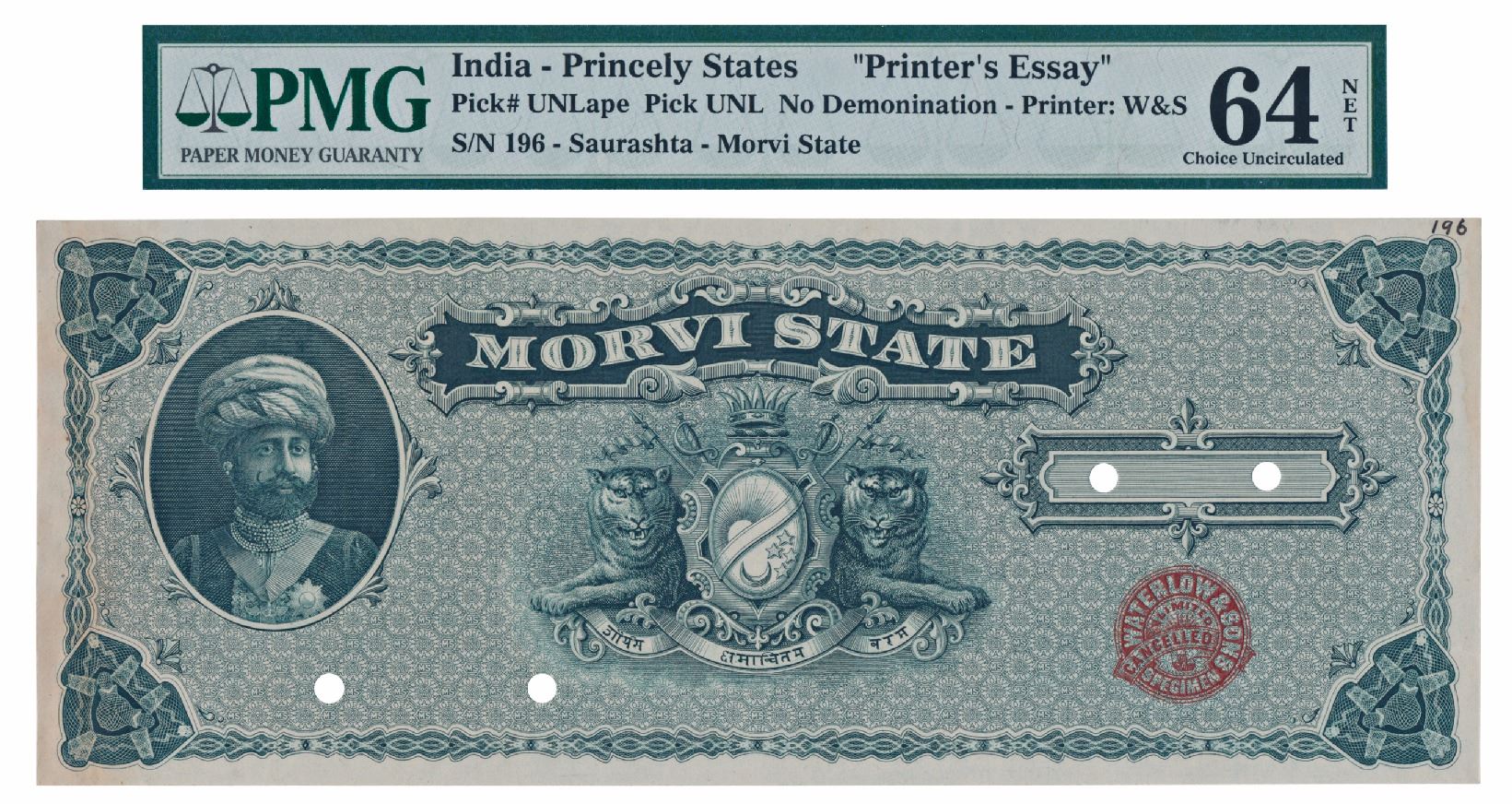 Morvi, Printers Essay, coat of arms of the state in center, with the portrait of the ruler Maharaja Shri Sir Waghji II Rawaji at right, stamped at bottom right Waterlow & Sons / Specimen / Cancelled, the size indicates that the Specimen may have been for a Stamp Paper of the state. Graded by PMG 64 Choice Uncirculated, Very Rare.