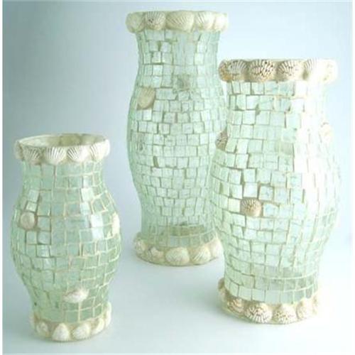 Sparkling handset mosaic glass hurricane candle holders shimmer with and without candlelight. Real sea shells decorate the beautiful pale green glass. Email us for the medium, 11.5" tall, $195 or the large, 14" tall, $215.