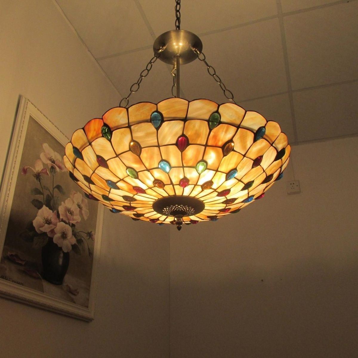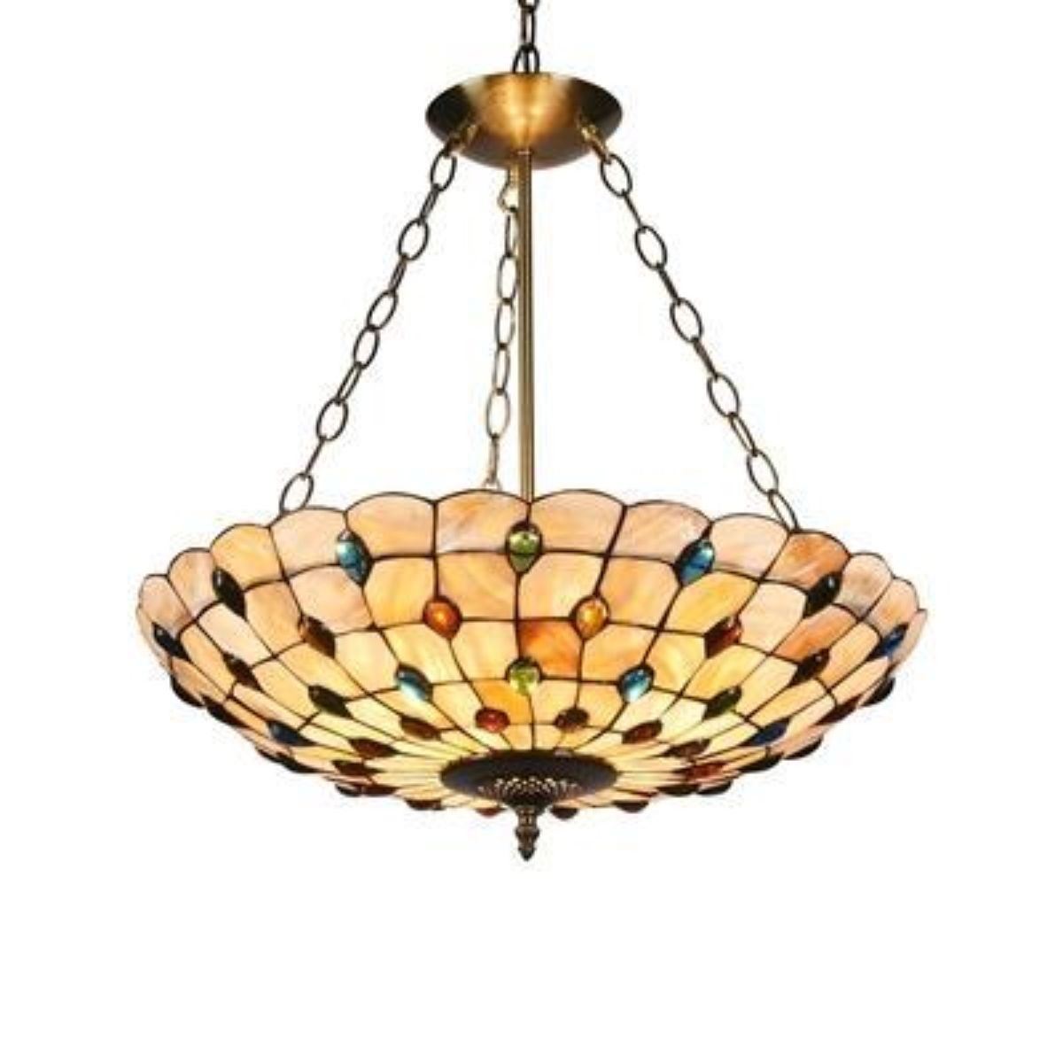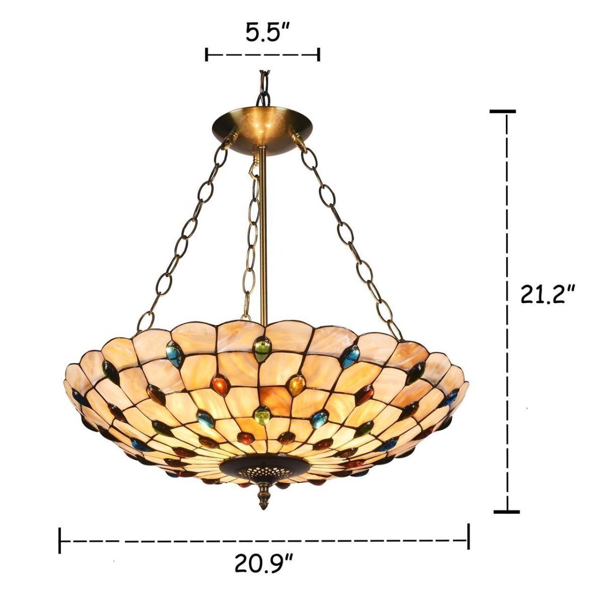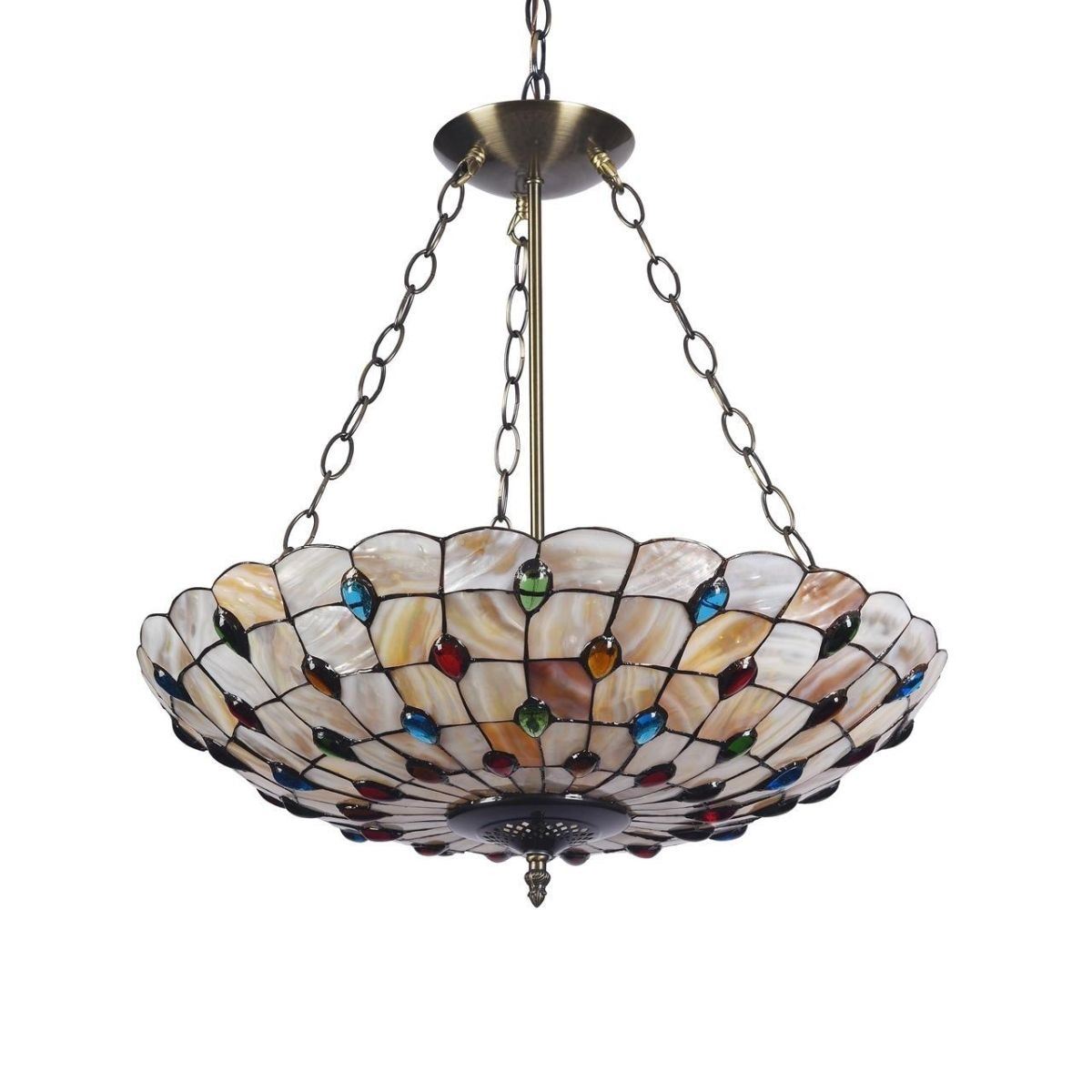 Mosaic-style 3 light ceiling pendant with hand-cut, seashell shade, crafted from over 140 seashells & 56 glass beads, each piece wrapped in fine copper foil in antique bronze finish. 20" W shade. 21 1/2" overall height. 6lbs weight. Comes with 60" ceiling chain. Â