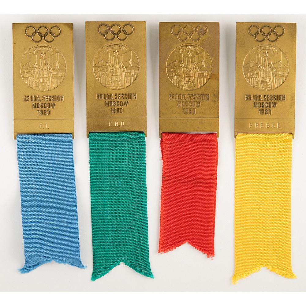Four badges from the 83rd International Olympic Committee session in Moscow, measuring each 33 mm x 64 mm with ribbons below, featuring Olympic rings at the top and a Moscow image in the center, reading, "83 I.O.C. Session, Moscow, 1980." The badge with the red ribbon is blank, and the others are engraved with their designation: "F.I." [blue], "Presse" [yellow], and "C.N.O." [green]. At this session, hosted alongside the Games of the XXII Olympiad, Juan Antonio Samaranch was elected as president of the IOC.