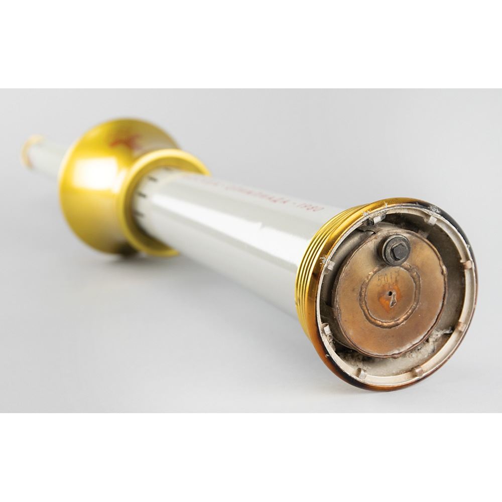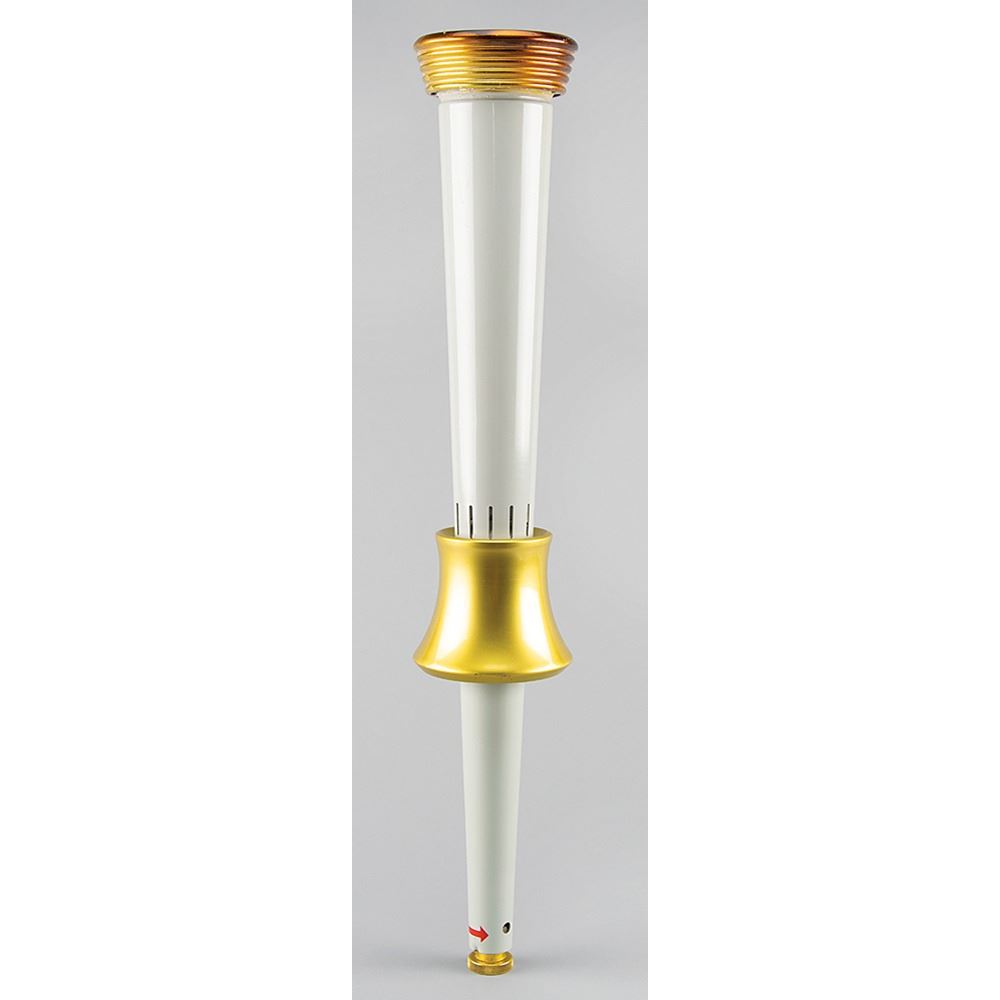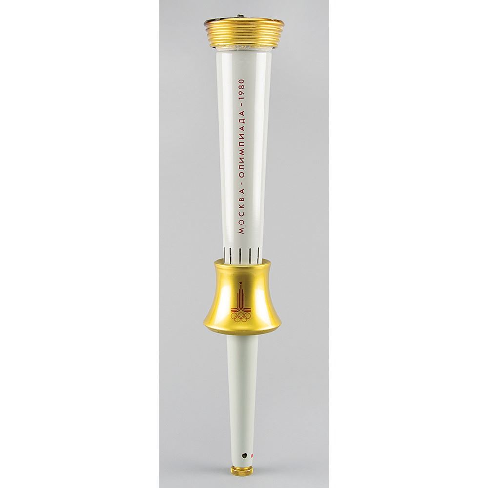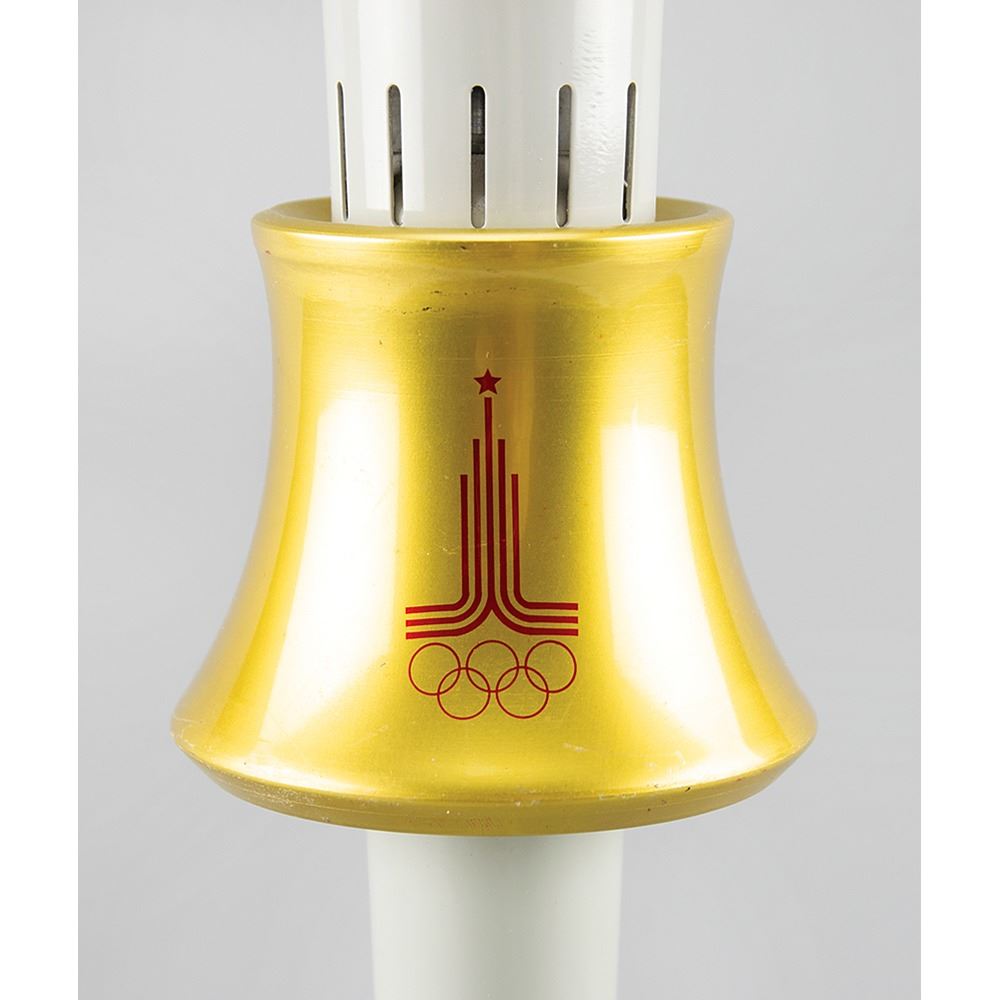Official 1980 Moscow Olympics torch, comprised of aluminum, measuring 22″ in length and 4″ at its widest point, designed by Boris Tutschin. The gray body features red text in Cyrillic, "Moscow-Olympiad-1980," and a gold-colored top of the handle bears the emblem of the Games and Olympic rings. The top is also accented with a golden ring. Burner remains in place. Darkening to top from use, and some scuffs to body. In all, about 5,435 torchbearers participated in the relay, which lasted from June 19 to July 19. These Olympics were especially controversial due to the USSR's recent invasion of Afghanistan, and the United States led 65 countries in a boycott of the Games.