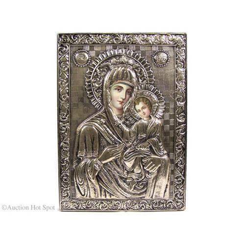 We do not know a lot about this item so we'll try to describe it the best we can. It is a piece of Russian Orthodox art purchased in Red Square, Moscow during the time before the fall of communism in the USSR. It was then put on exhibit at the Jabits Center in New York City, for specific artists that represented different republics in the Soviet Union. This beautiful piece was handcrafted by a Muscovite artisan that lived in the central artist community near Red Square. It depicts the Virgin Mary with the "Holy Infant", both dawning halos. There is a marking at the top left corner which says: "MP", which might be the artists' stamp. The stamp at the top right is the Russian orthodox religious symbol. A fantastic item,don't forget to check out all the pictures!