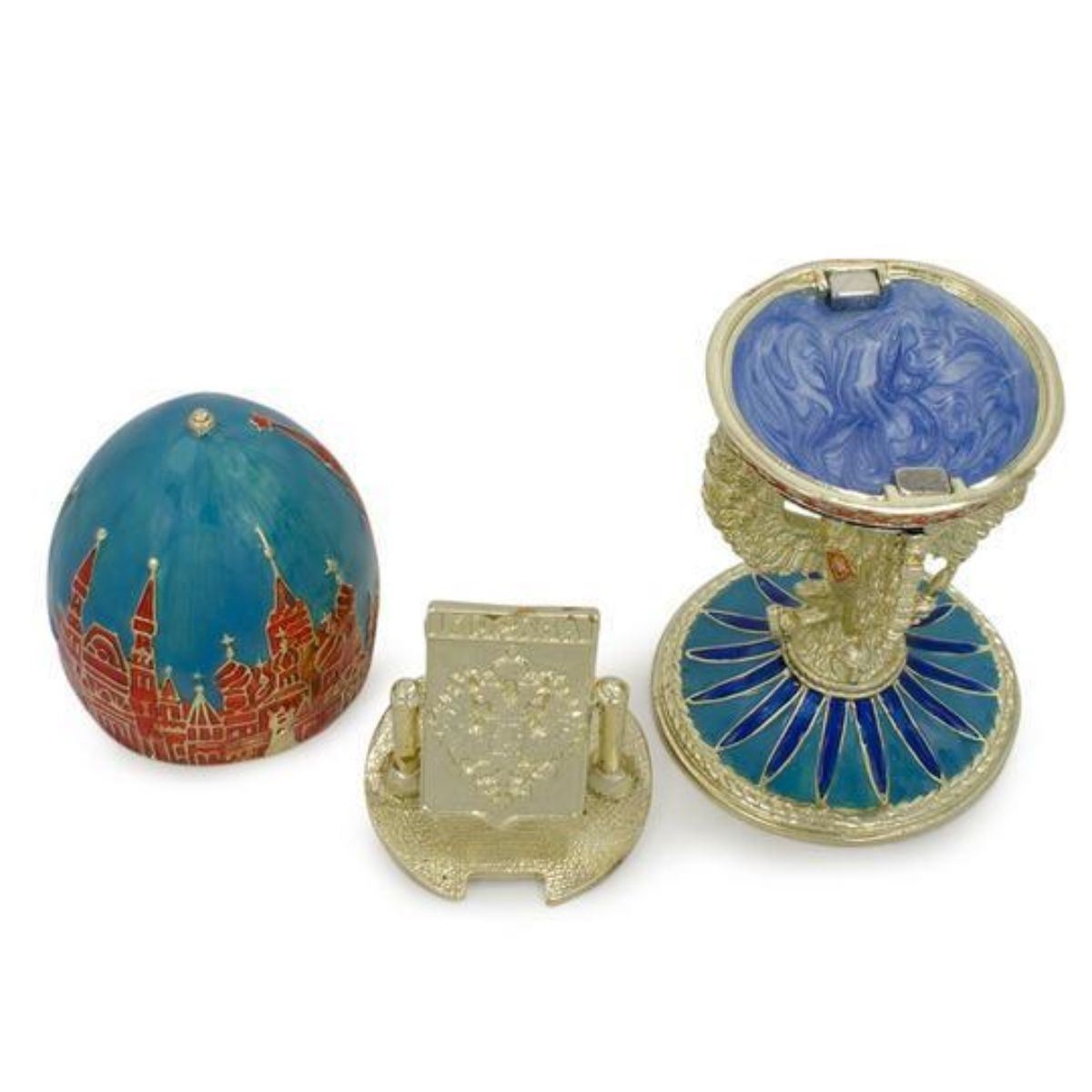 4.25" Moscow Kremlin on Double-Head Eagle Royal Inspired Russian Egg Accentuate the look of your interior with the 4.25" Moscow Kremlin on Double-Head Eagle Faberge Inspired Russian Easter Egg. It is perfected from fine Pewter and has been set with sparkling crystals. It is also a great decorative collectible. 4.25'' (H) Pewter, Crystals, Enamel Gift Boxed