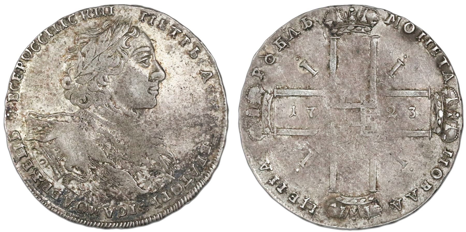 Moscow (Red Mint), Russia, 1 rouble, 1723-OK, Peter I, in mantle, small cross, PCGS XF 40. KM-162.3. Mottled toning all over, slightly weak in centers, muted luster. PCGS #36269108.