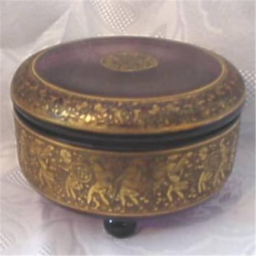 Moser 5" wide, amethyst covered box with Warrior Band, signed, made in Austria, 1858-1924. Excelent Condition.