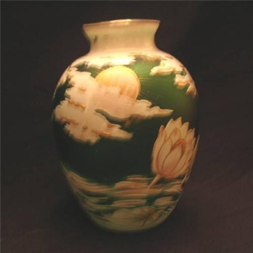 Moser Cameo vase decorated with a moon over a pond of water lilies, with gold enamel, 5 1/4" tall. 1858-1924, made in Austria.