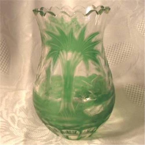 Moser cameo and intaglio bulbous vase, sawtooth rim, decorated with green cut to clear wooded widlelife scene, 4 1/4" tall. 1858-1924. Excelent condition.