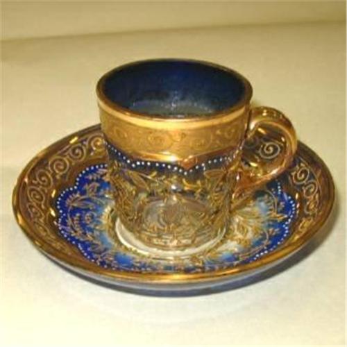 Moser cobalt to clear cup & saucer with gold enameling. Cup is 2 1/2" tall and the saucer is 4 1/4" wide. 1858-1924, excelent condition.