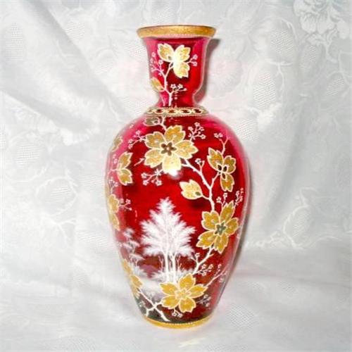 Moser 11 1/4" Cranberry/Coraline Vase enamel decorated with a Forest Scene. Excelent condition. 1858-1924.