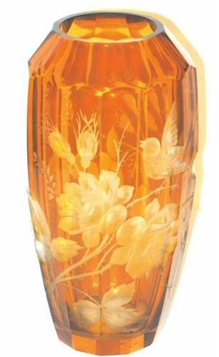Magnificent unsigned but typical of Moser's work is this Amber cut (deep cut) to clear vase. 10 sided, graduated. Depicting floral and birds. Mint! Almost 10" tall! (7-7)