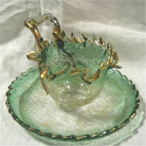 Moser Dessert Cup & Saucer with blue/green edge, 3" x 5 1/5". 1858-1924, mint condition.