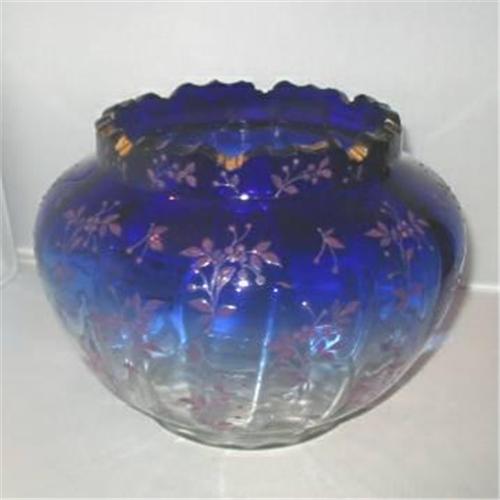 Moser 5 7/8" x 8" Cobalt to clear, lavender enamel decorated bowl. 1858-1924. Excelent.
