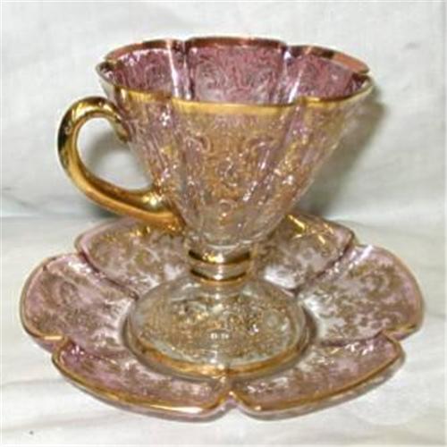 Moser footed cup and saucer, cranberry to clear with gold enameling and tiny flowers. Cup is 3 1/2" tall and the saucer is 5" across. Early 1900's. Mint condition.