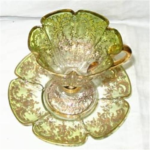 Moser footed cup and saucer, green to clear with gold enameling and tiny flowers. Cup is 3 1/2" tall and the saucer is 5" across. Early 1900's. Mint condition.